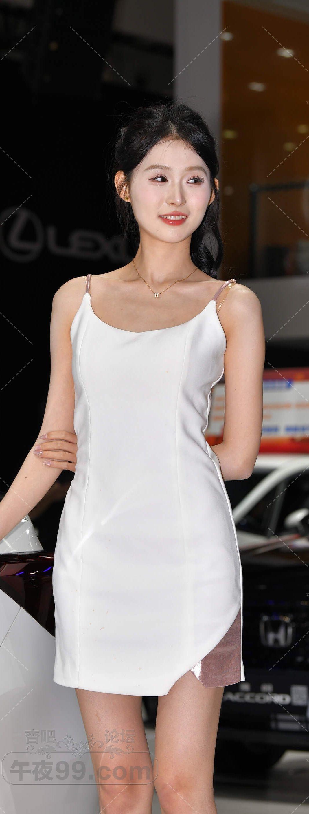白色吊带连衣短裙美女车模站立姿势修长美腿吸睛【10P】